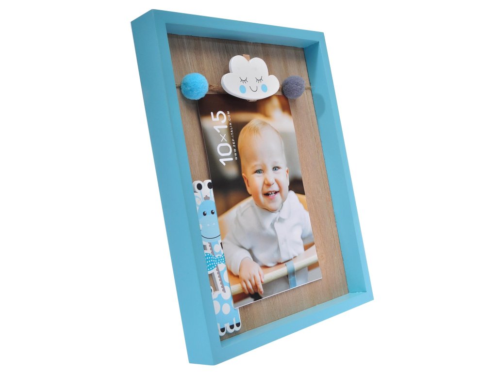 Dětský rámeček, netradičního provedení. fotografii nedáváte za sklo jako obvykle ale fotku pověsíte pomocí kolíčku schovaného za mráčkem na provázek. Určeno pro fotku 10x15 centimetru ale rozměr se může díky provedení mírně lišit. K postavení na rovnou plochu.